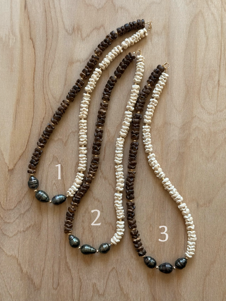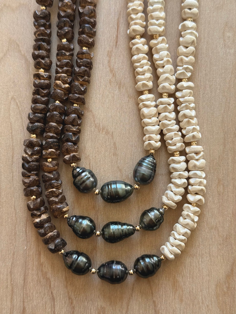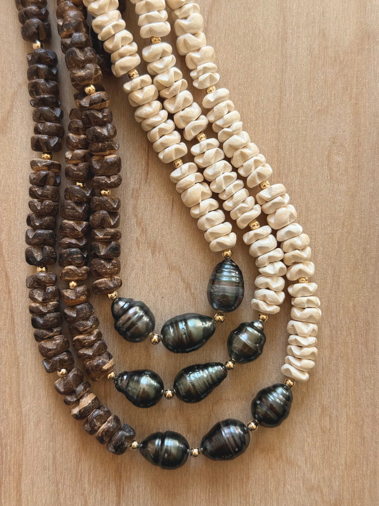 Coconut Blossom beads and Tahitian Pearl. Gold filled clasp and beads. Approx 16 inches.