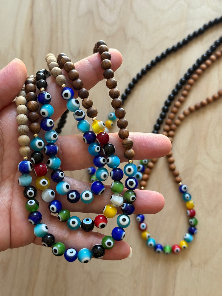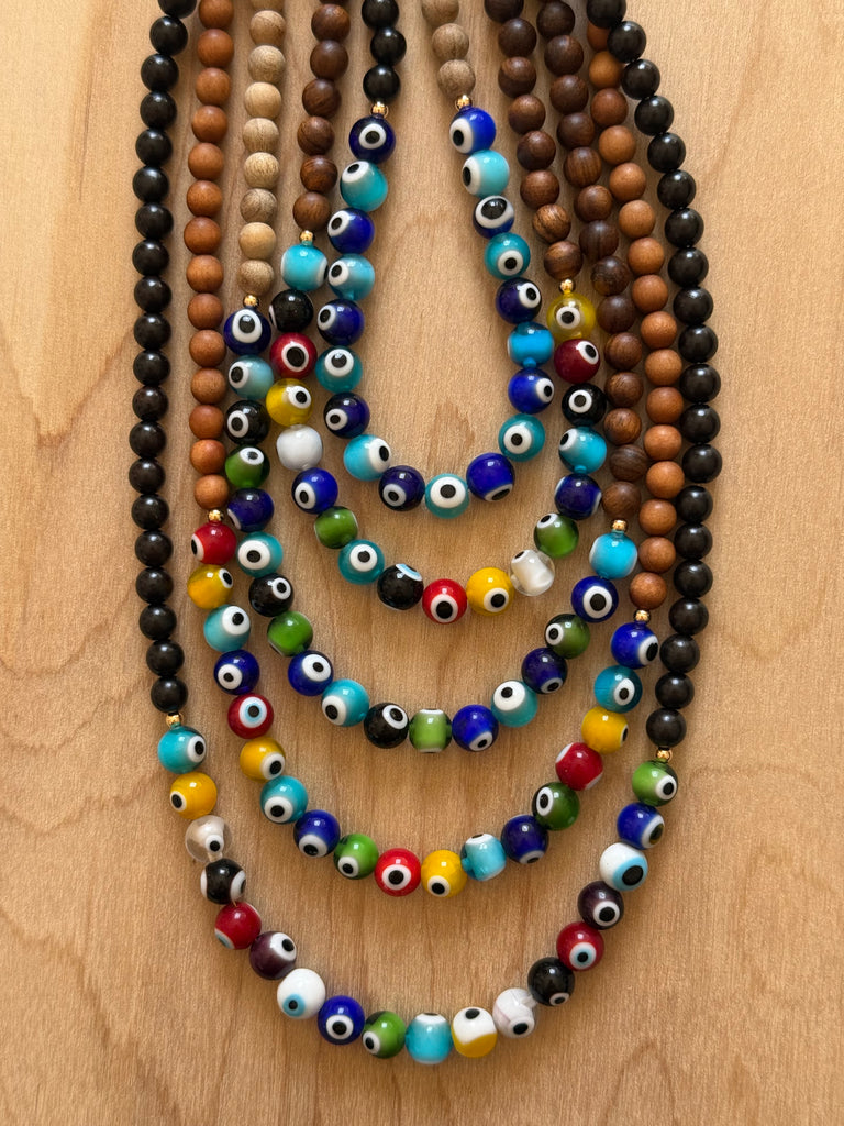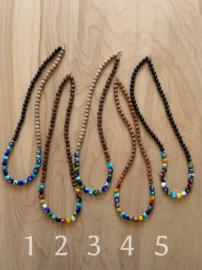 Glass Evil Eye and Sandalwood necklace. Approx 18 inches. Gold filled clasp and beads.