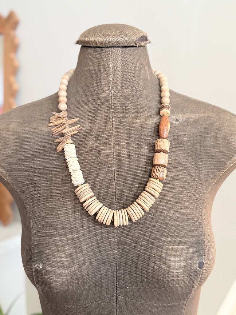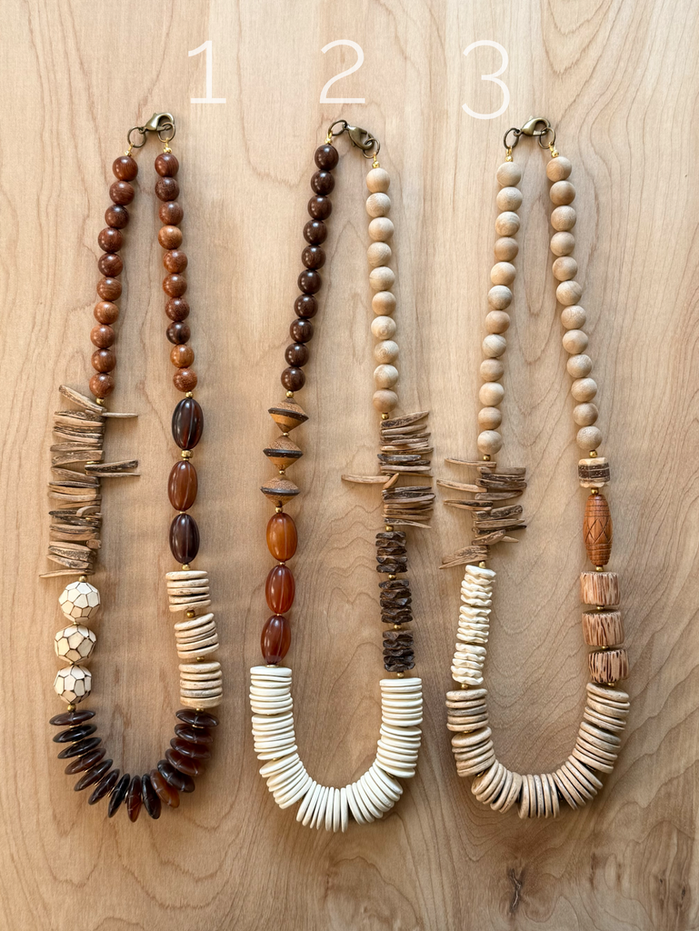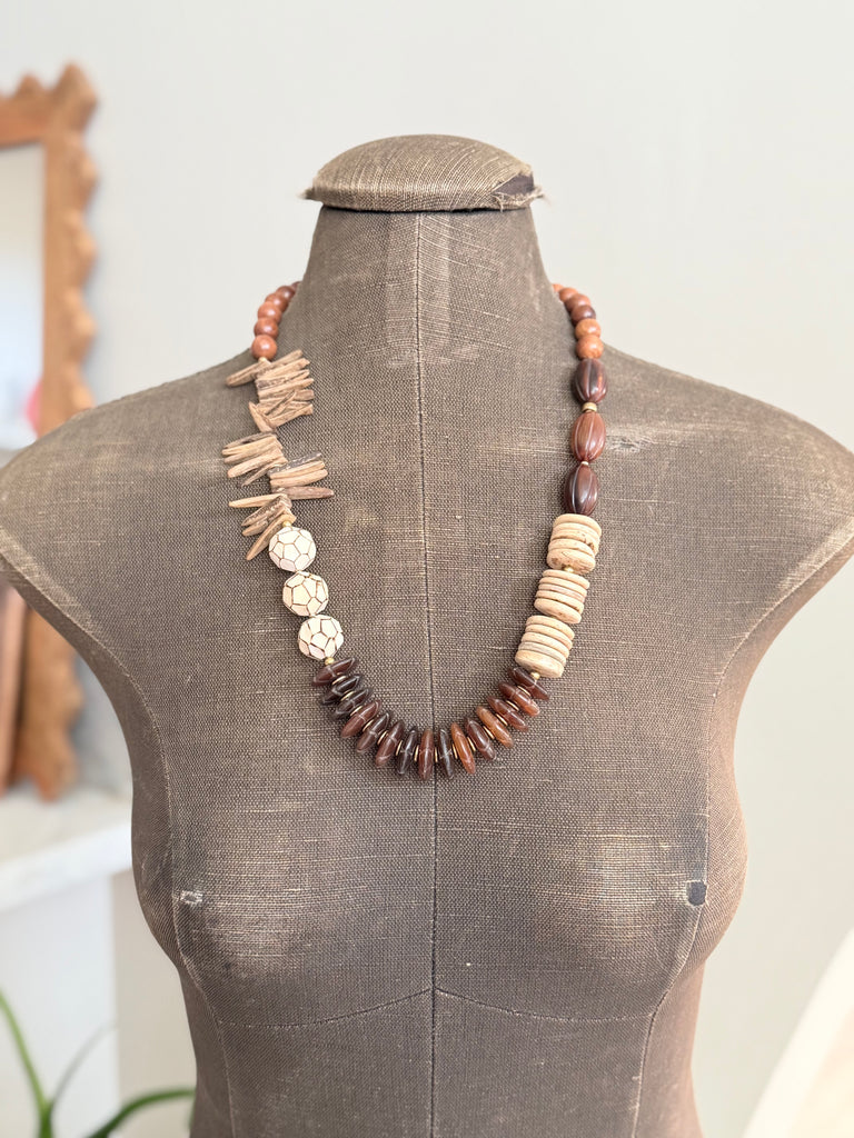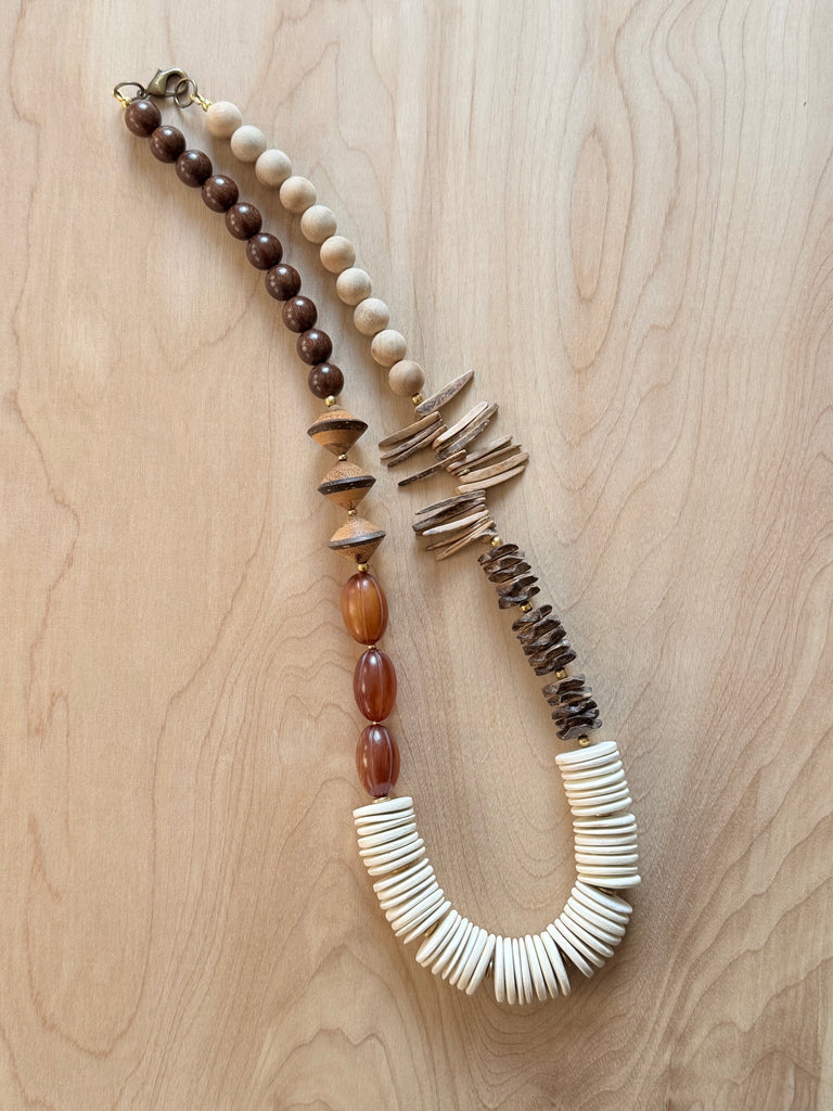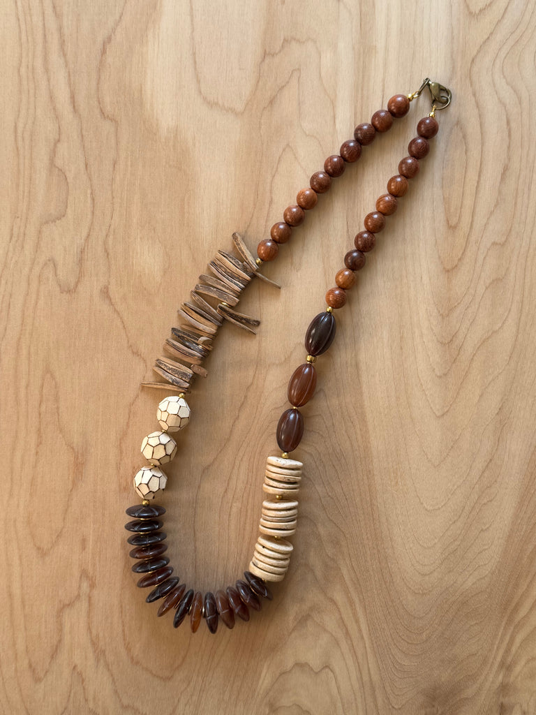Funky Chunky Coconut necklace. Coconut, Wood, Sandalwood, Horn and Palm Wood mix. Plated Hook. Approx 26 inches.