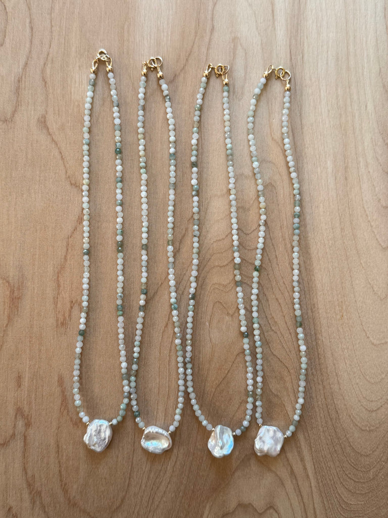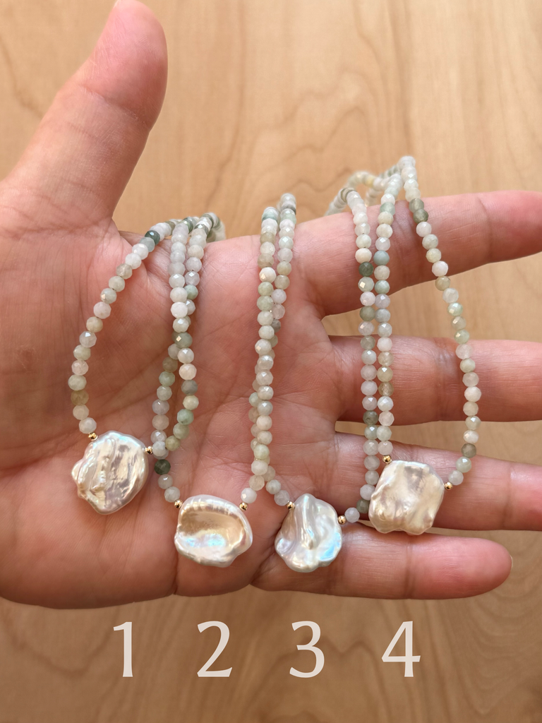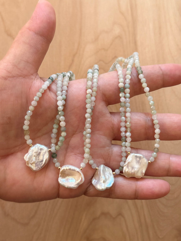 mini Keishi Pearl and Burma Jade necklace. Approx 16 inches. Gold filled. Gold filled clasp and beads.