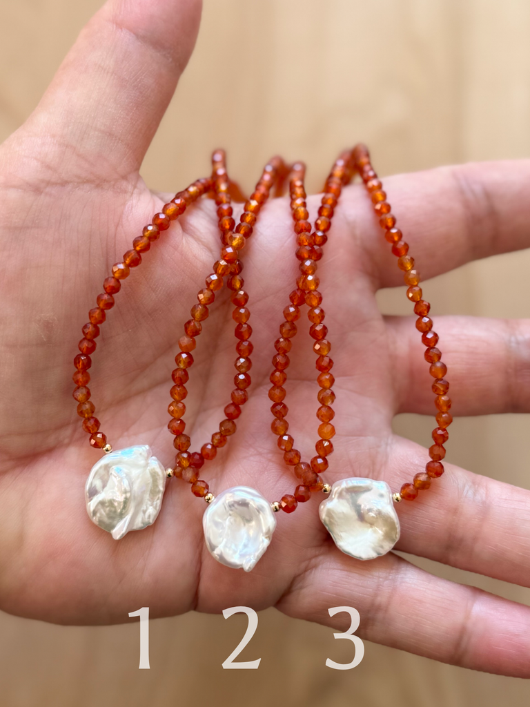 mini Keishi Pearl and Carnelian necklace. Approx 16 inches. Gold filled. Gold filled clasp and beads.