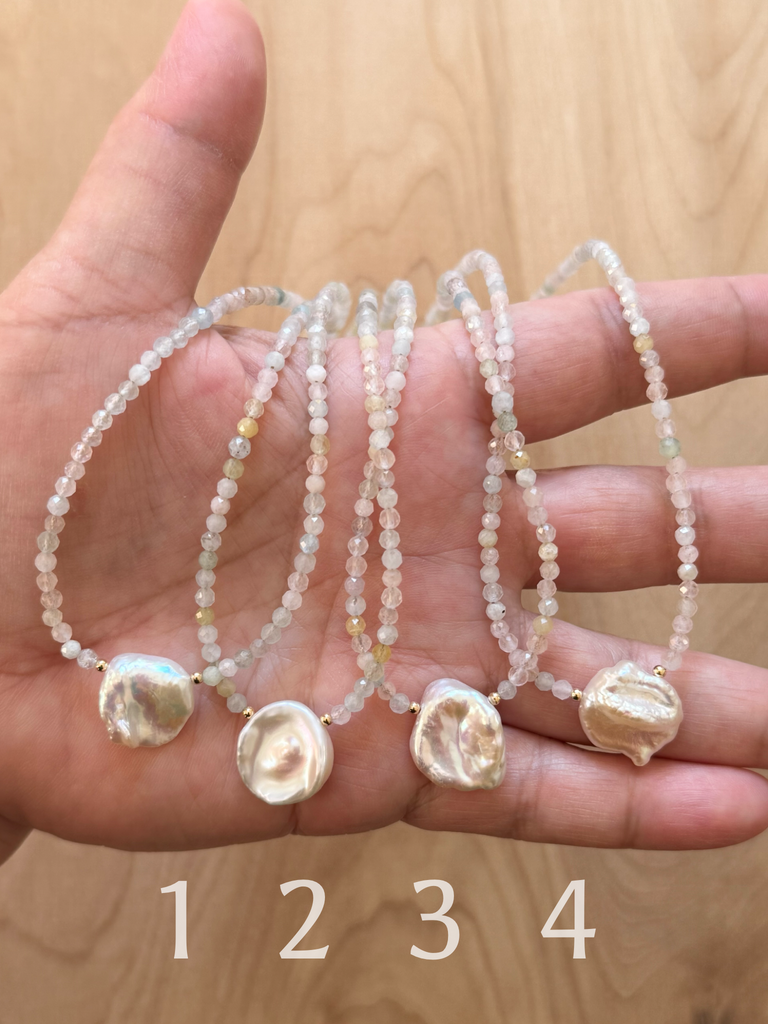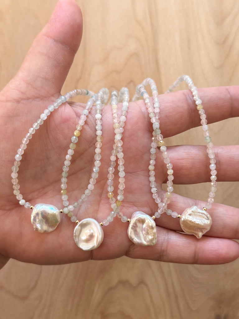 mini Keishi Pearl and Morganite necklace. Approx 16 inches. Gold filled. Gold filled clasp and beads.