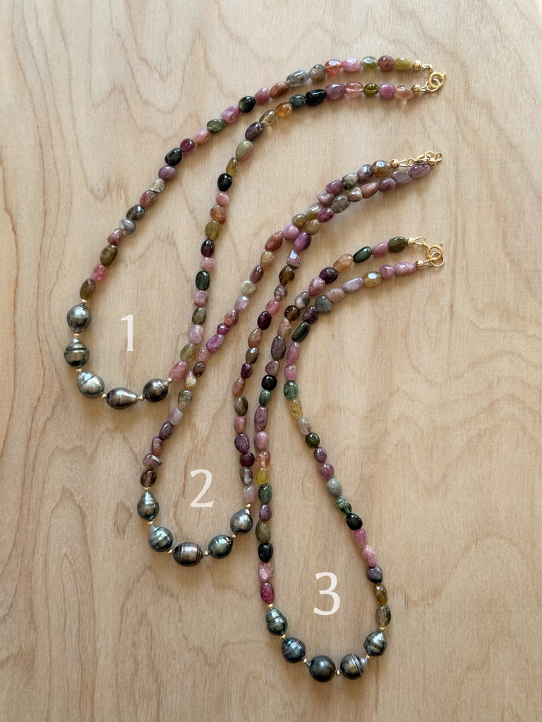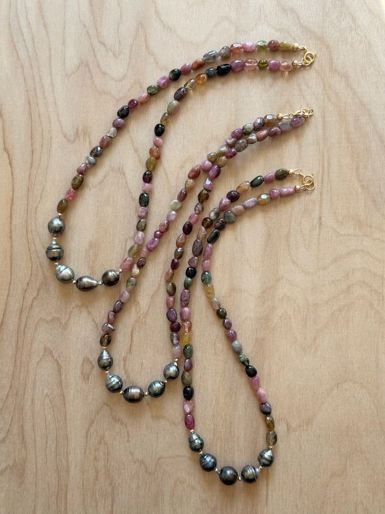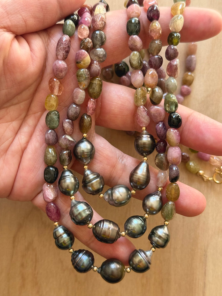 Tumbled Tourmaline and Tahitian Pearl necklace. Gold filled beads and clasp. Approx 18 inches.