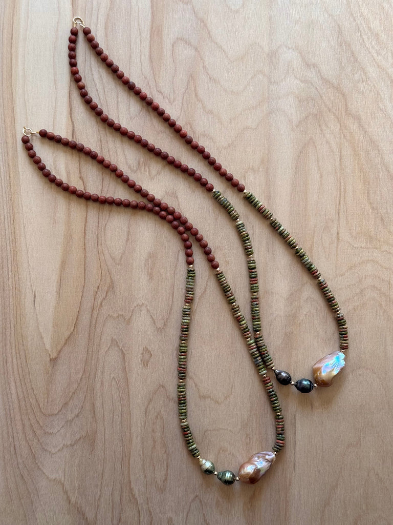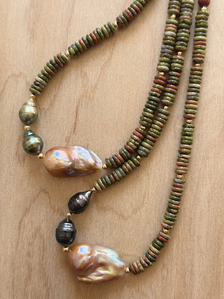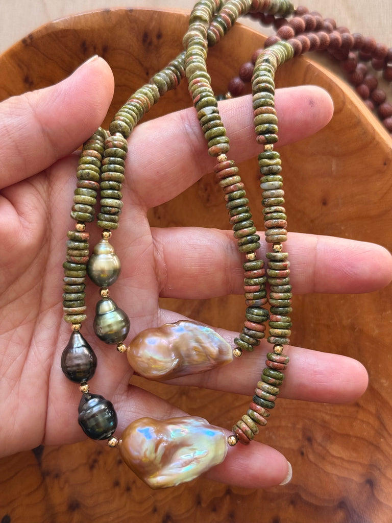 // Unakite, Baroque Freshwater Pearl, Tahitian Pearl, and Sandalwood. Approx 26 inches. Gold filled clasp and beads.