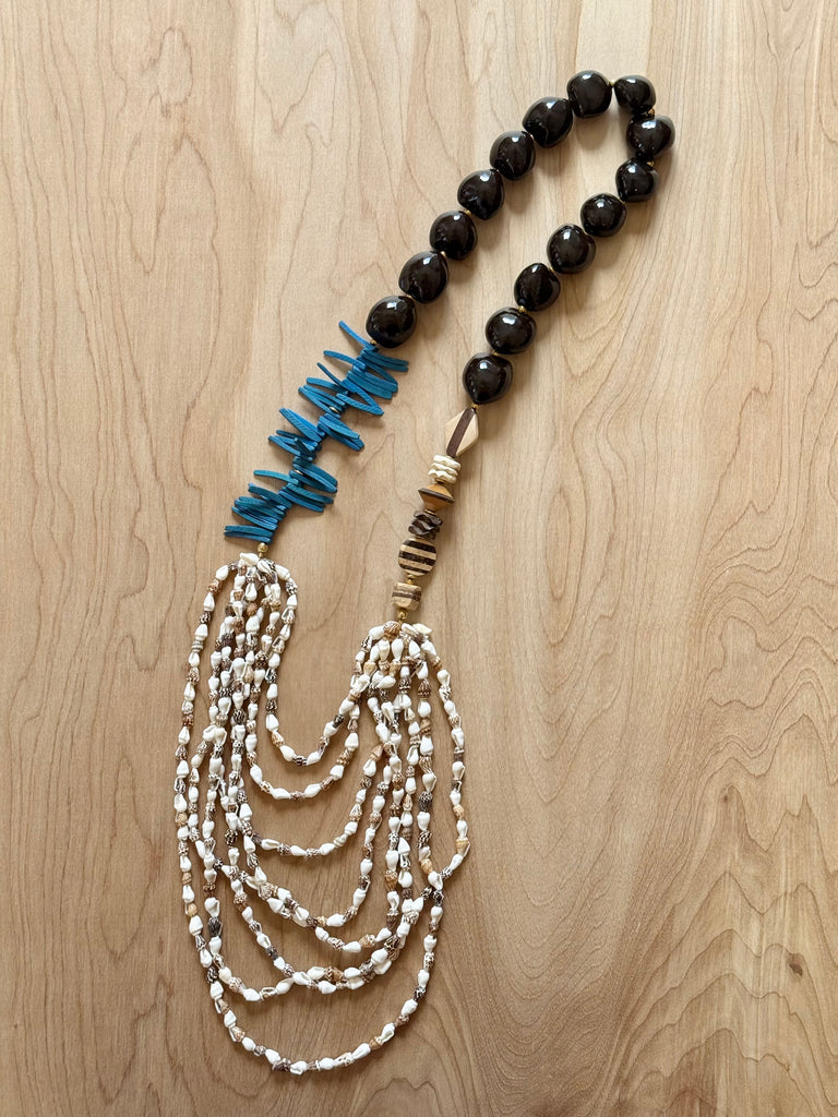 Made of shell, kukui nuts, coconut, wood and brass accent beads.