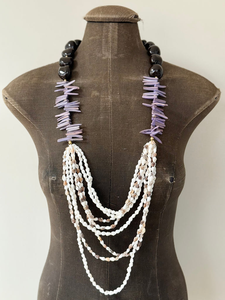 Made of shell, kukui nuts, coconut, wood and brass accent beads.