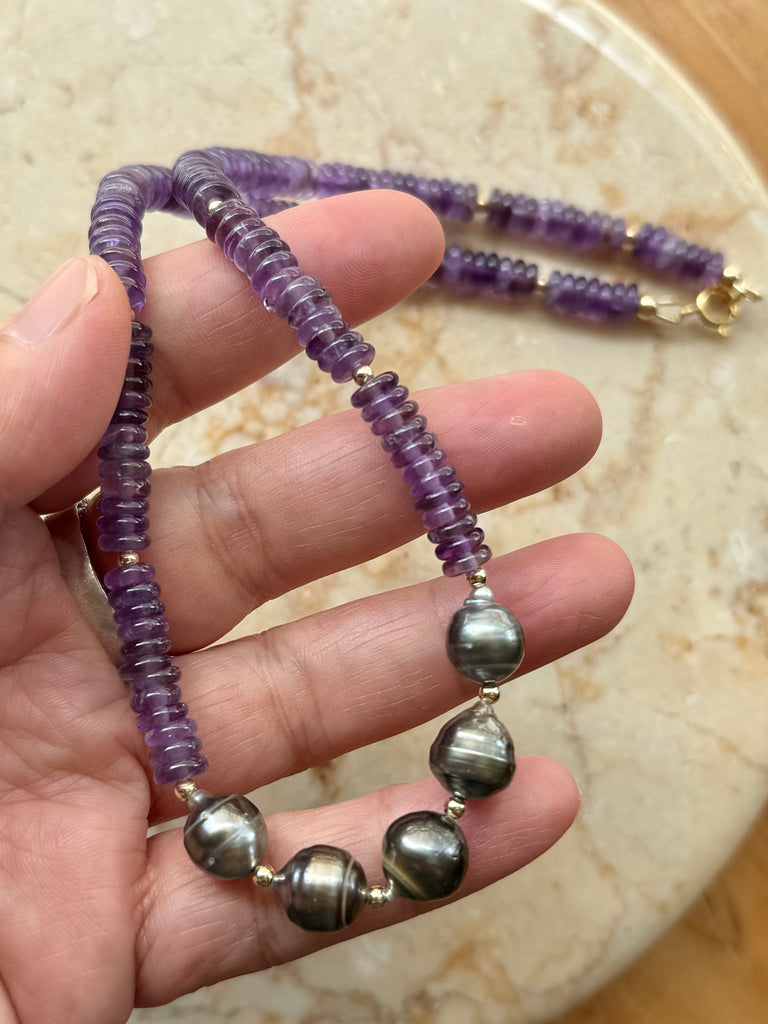 Smooth Amethyst and Tahitian Pearl necklace. Approx 17 inches. Gold filled accents and clasp.