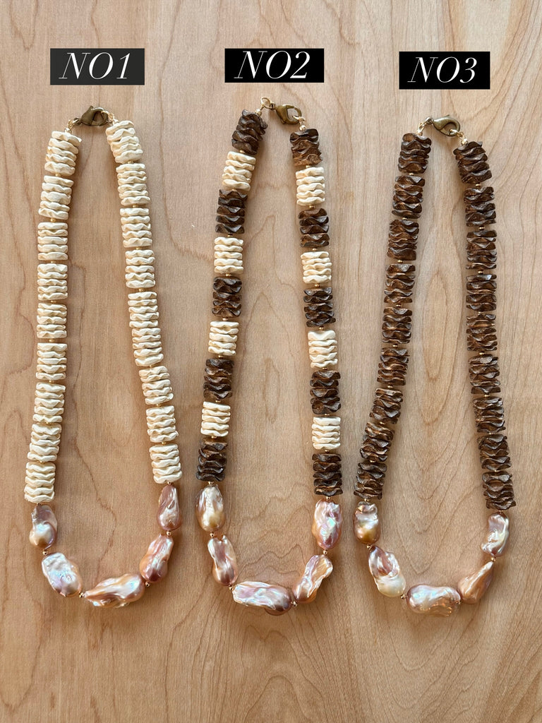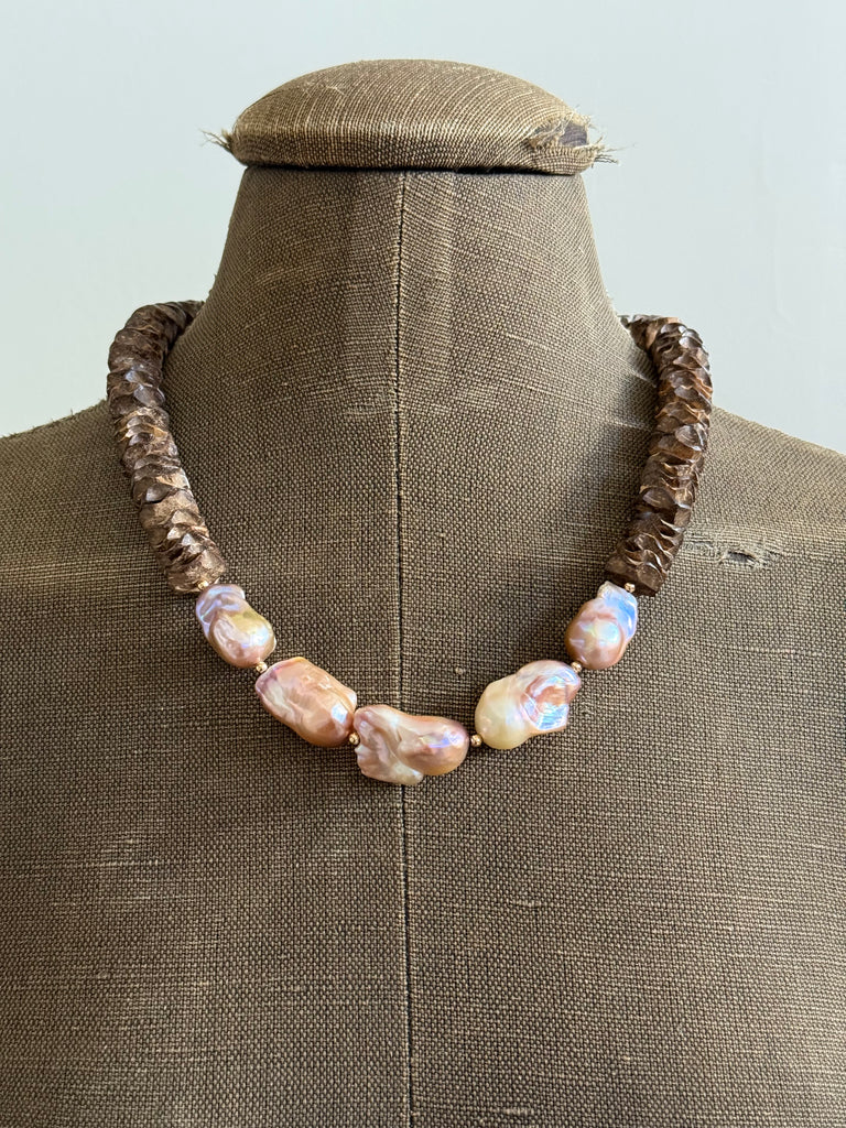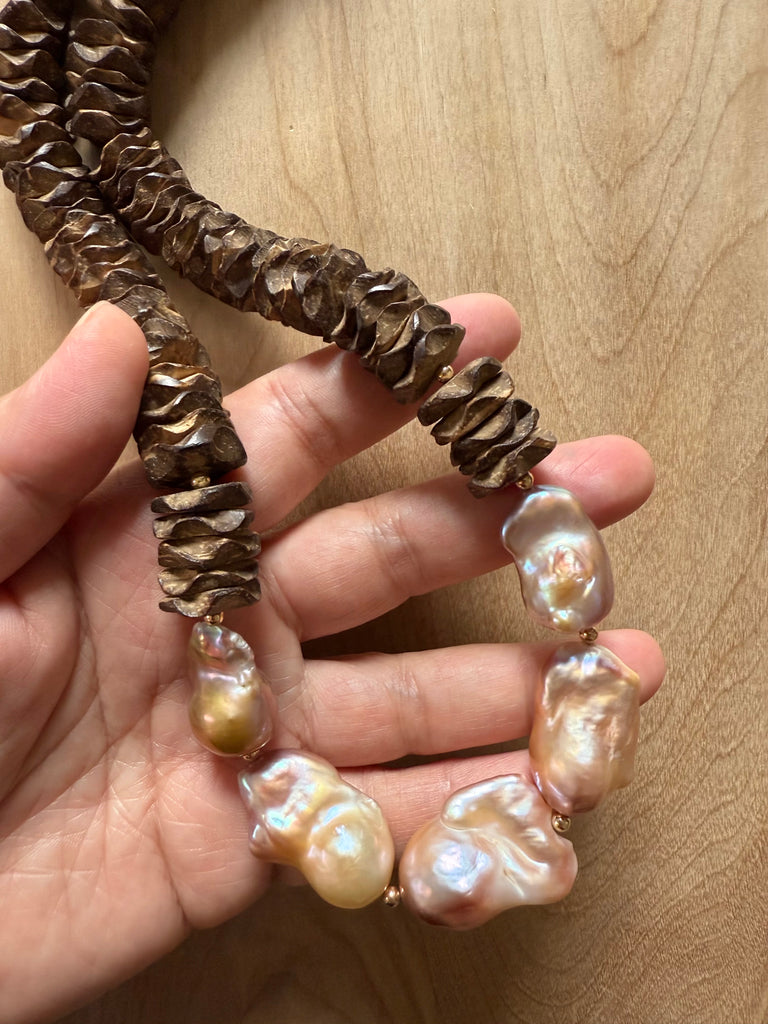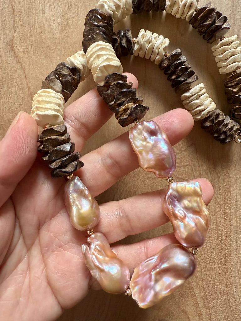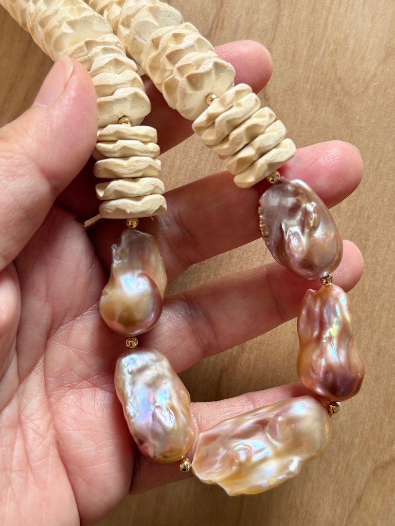 Chunky Statement featuring Coconut Blossom beads and large Baroque Pink Freshwater pearls. Gold filled beads and clasp. Approx 20 inches.
