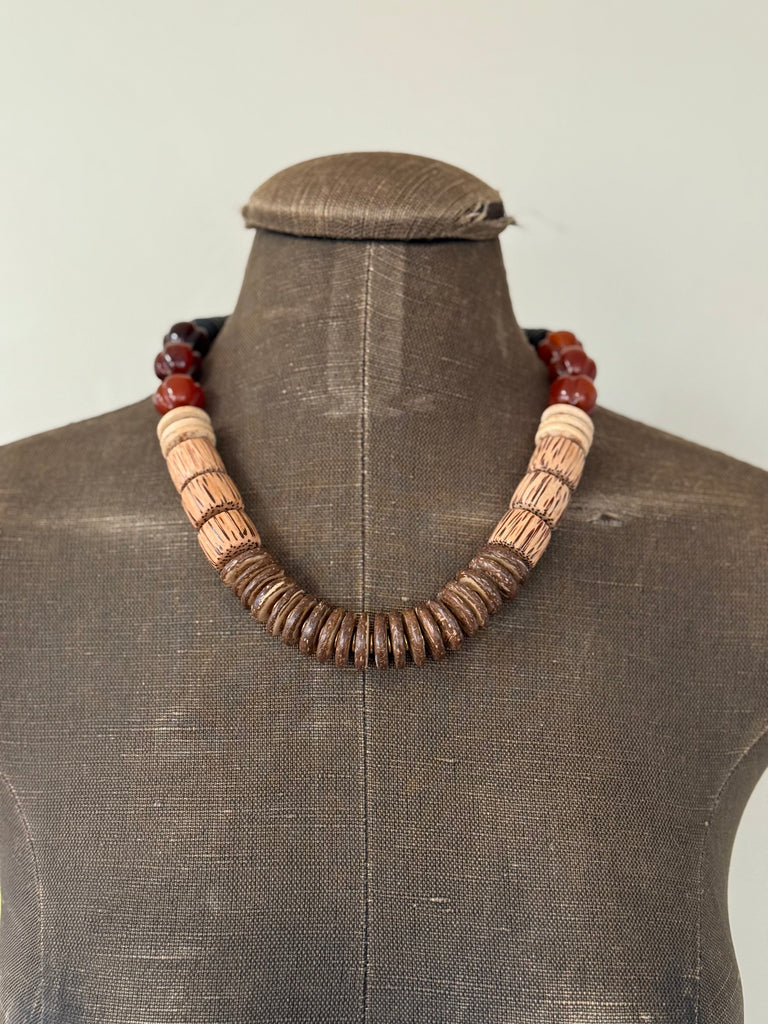 Chunky Statement necklace accented with coconut, palm wood, and horn. Brass bead accents. Approx 20 inches.
