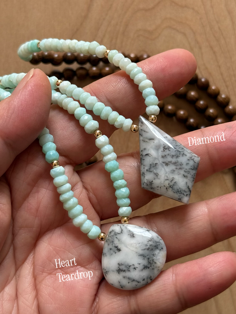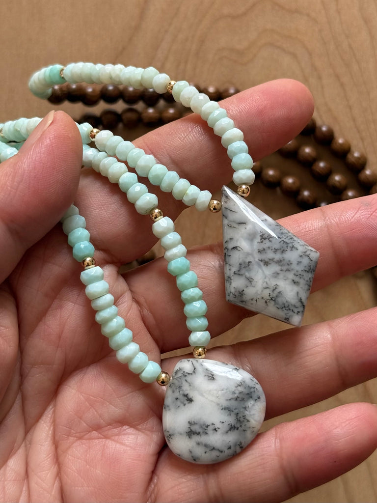 Smooth Dendritic Opal + Aqua Peruvian Opal and sandalwood l necklace. Approx 20 inches. Gold filled beads and clasp.