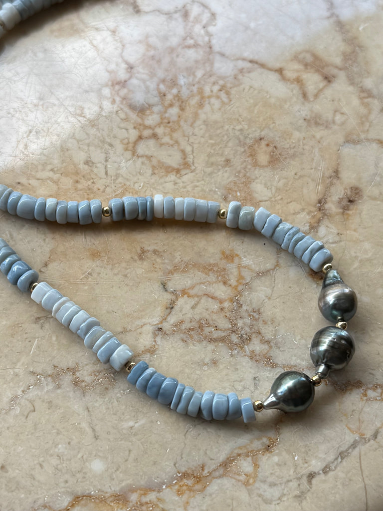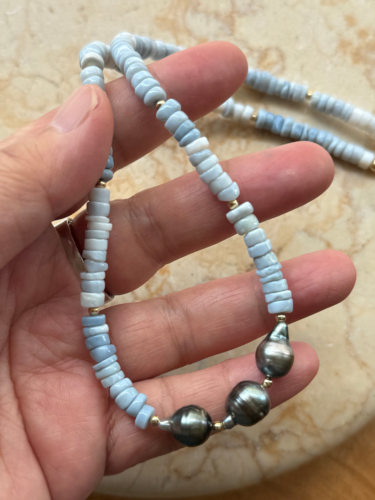 Owyhee Blue Denim Opal and Tahitian Pearl necklace. 18 inch. Gold filled beads and clasp.