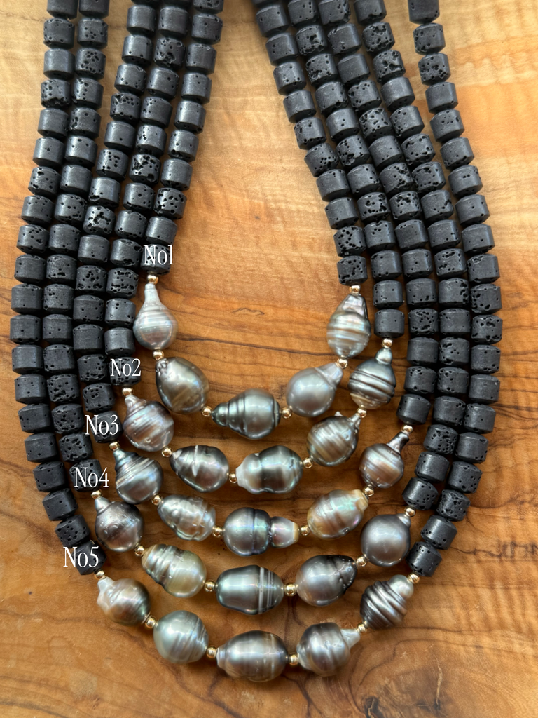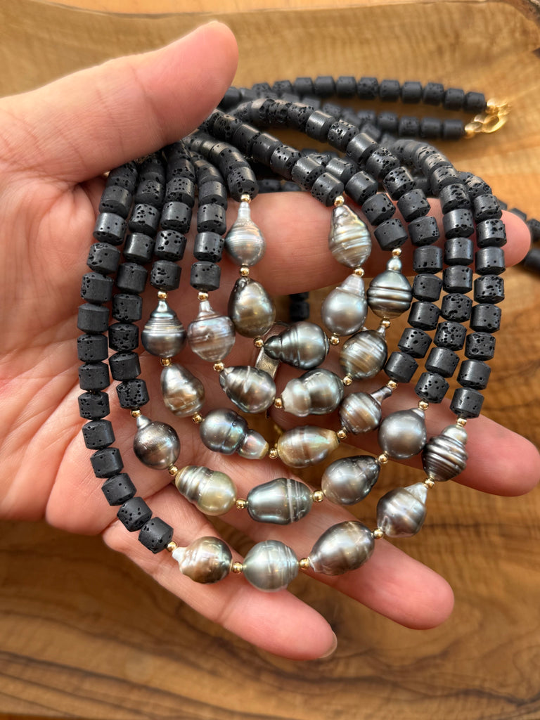 Volcanic Rock and Tahitian Pearl necklace. Approx 18 inches. Gold filled beads and clasp.