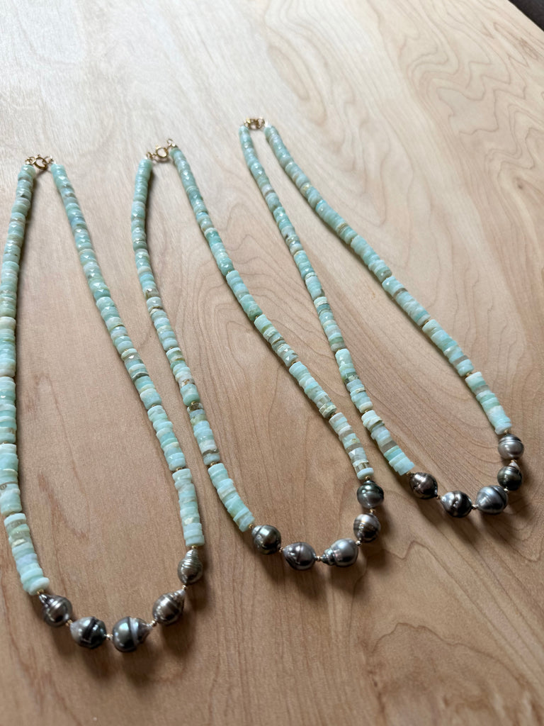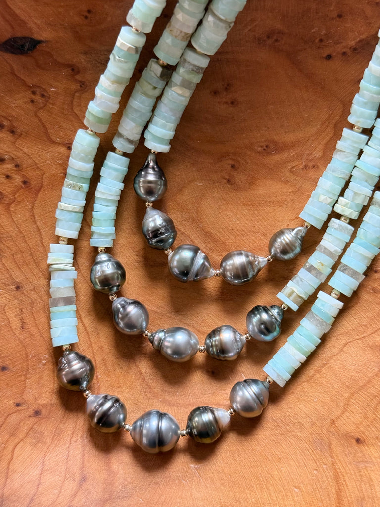 Faceted Peruvian Opal heishi and Tahitian Pearl necklace. Gold filled beads and clasp. Approx 18 inches.