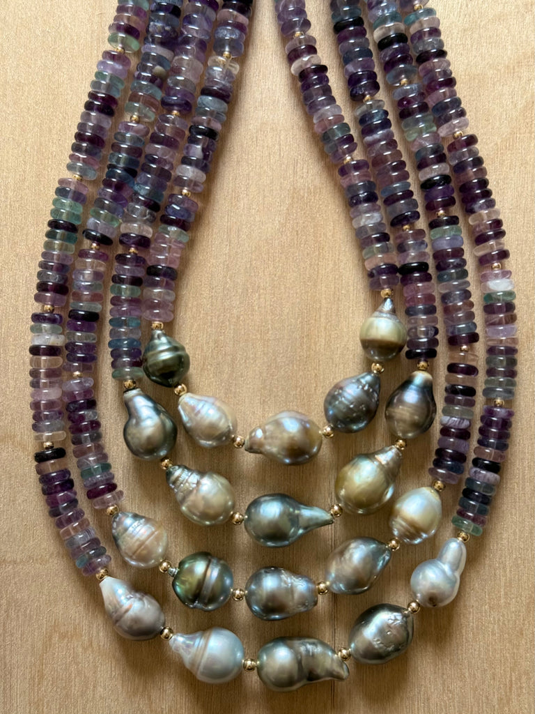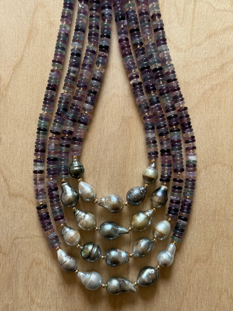 Rainbow Fluorite and Tahitian Pearl necklace. Gold filled. Approx 17 inches.