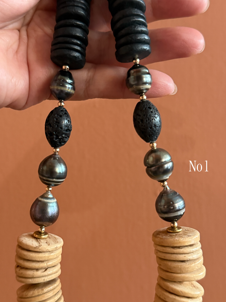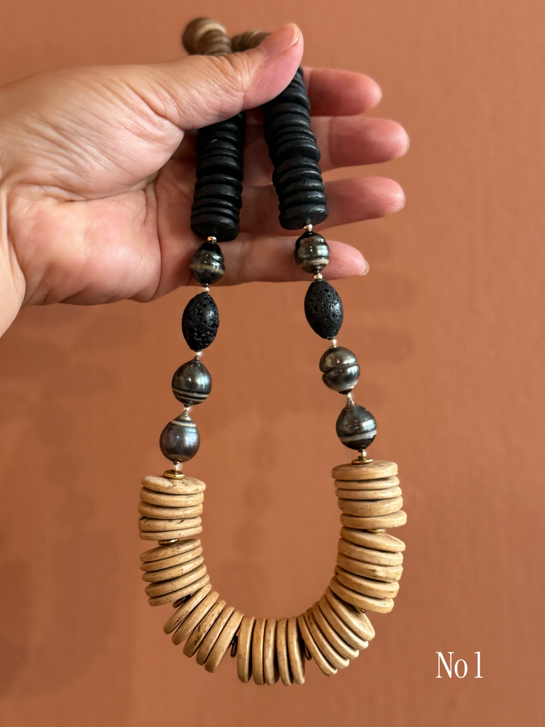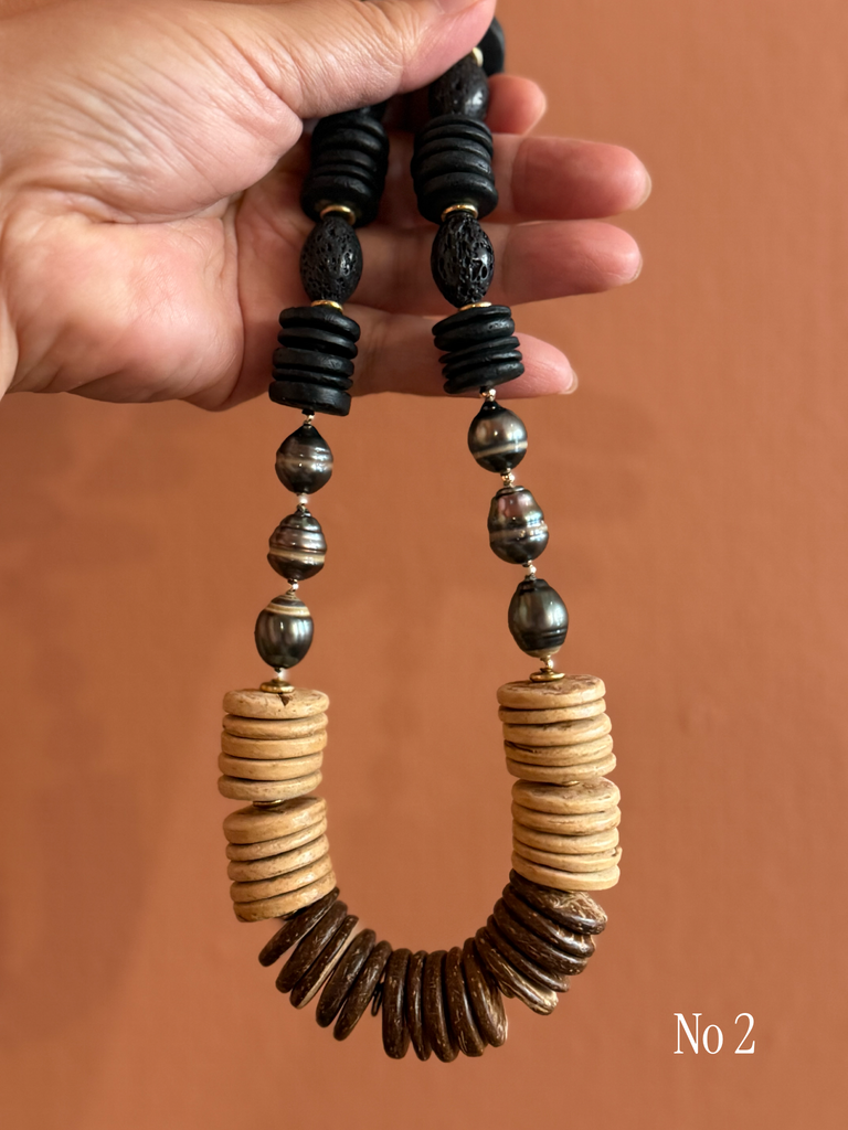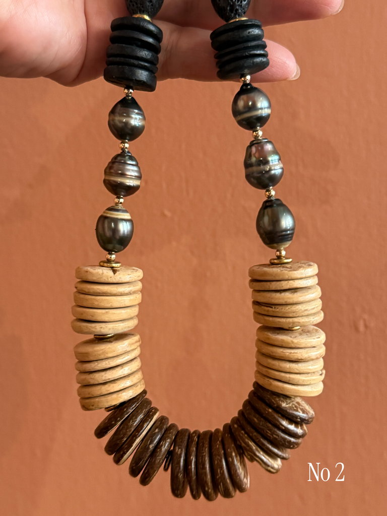 Statement Coconut and 6 large Tahitian pearl necklace. Lava and Brass accents. Approx 20 inches.