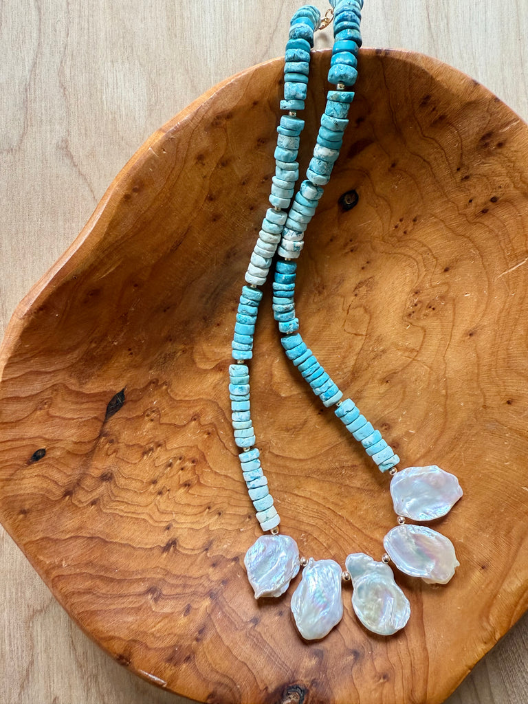 Turquoise and Keishi Pearl necklace. Gold filled beads and clasp. Approx 18 inches.
