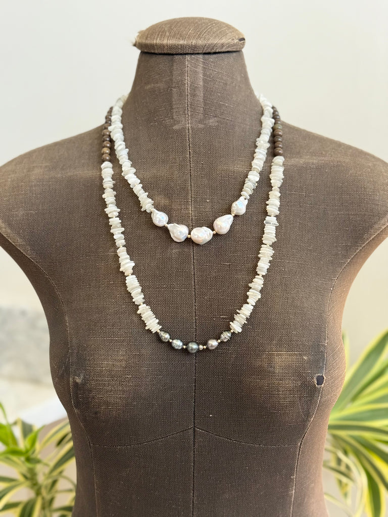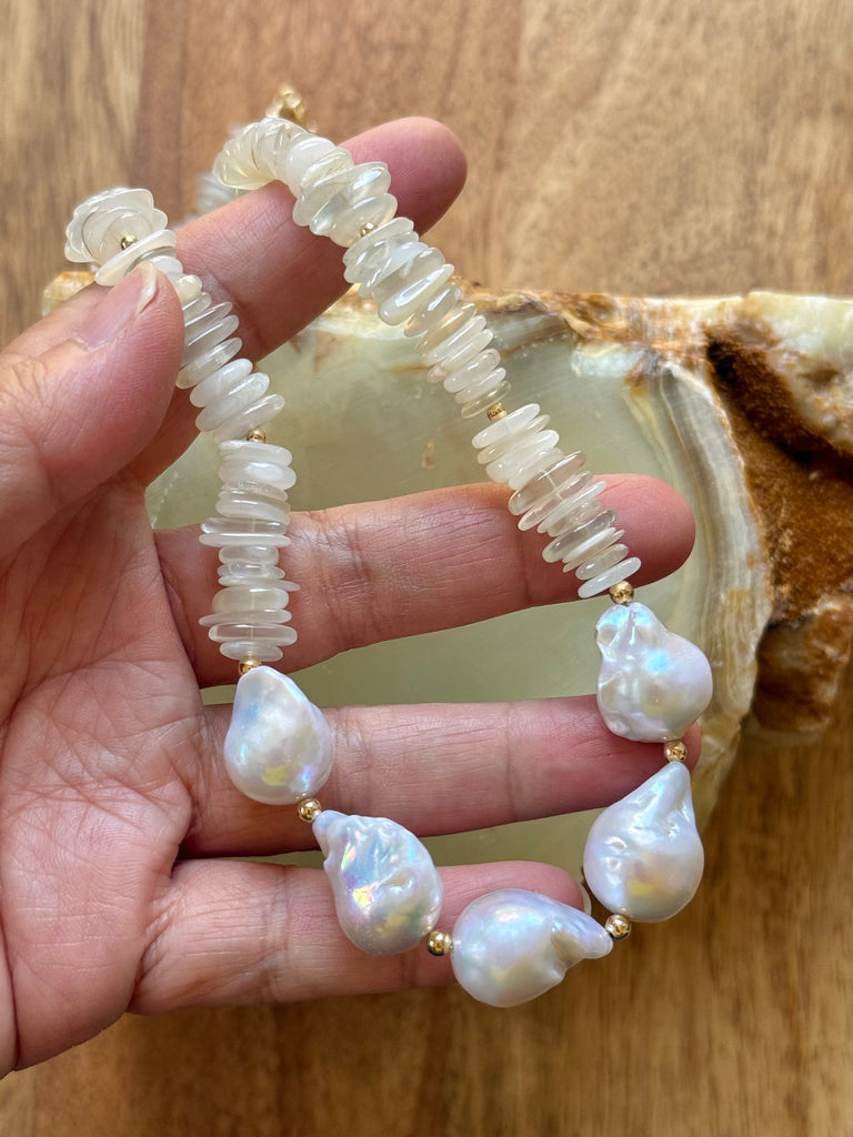 White Moonstone and Freshwater Pearl necklace. Gold filled beads and clasp. Approx 20 inches.