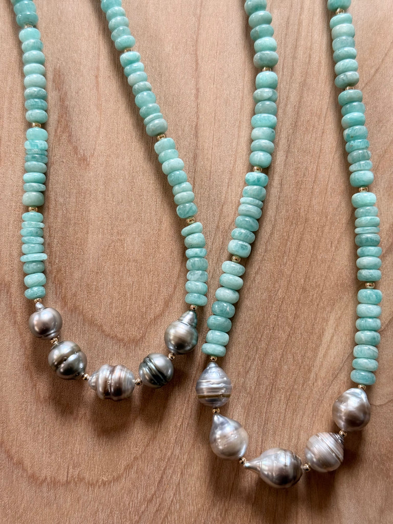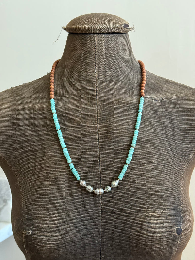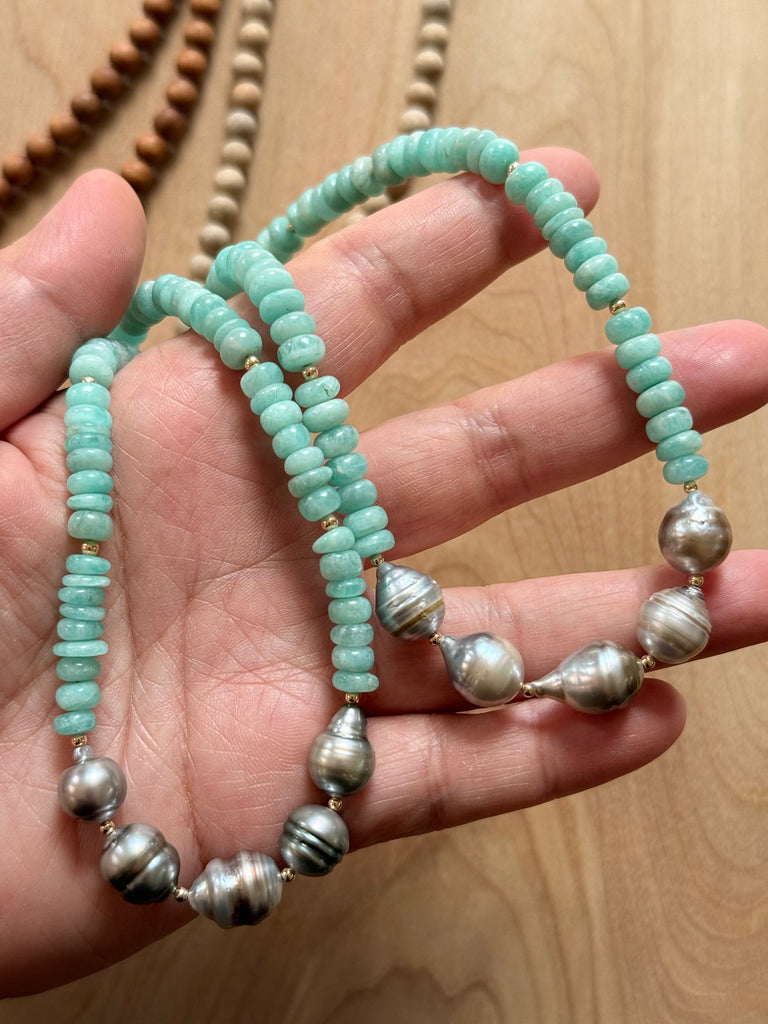 Smooth Amazonite, Tahitian Pearl, and Sandalwood necklace. Approx 26 inches.