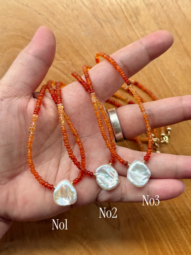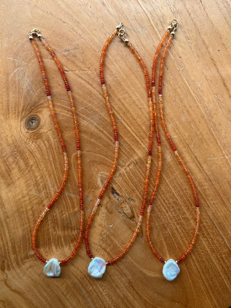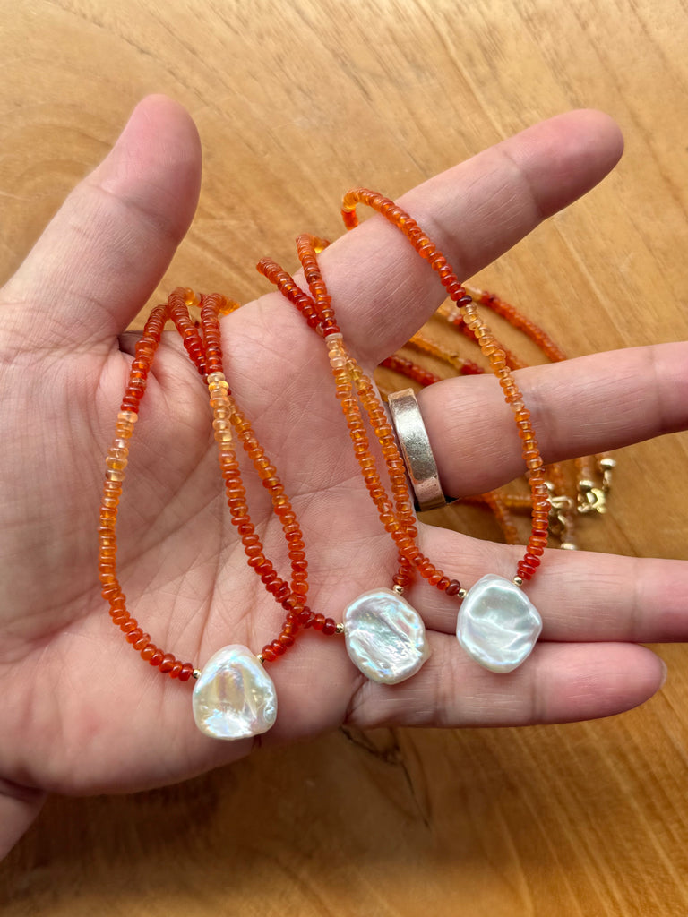 Mini Carnelian Ombré and KEISHI Pearl necklace. Approx 17 inches. Gold filled clasp and beads.